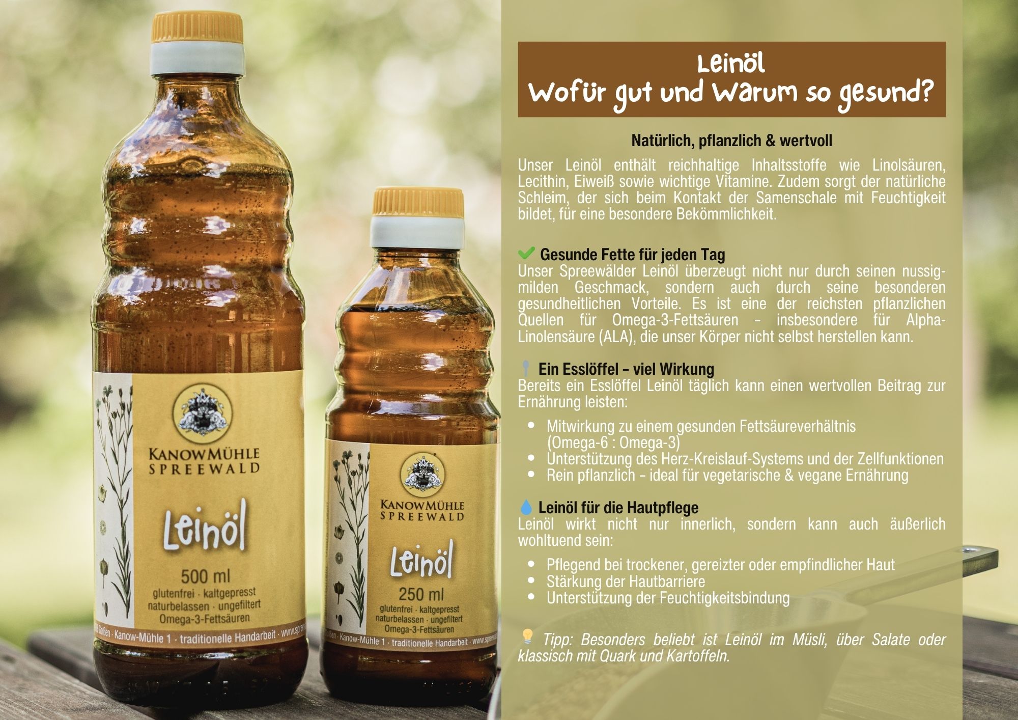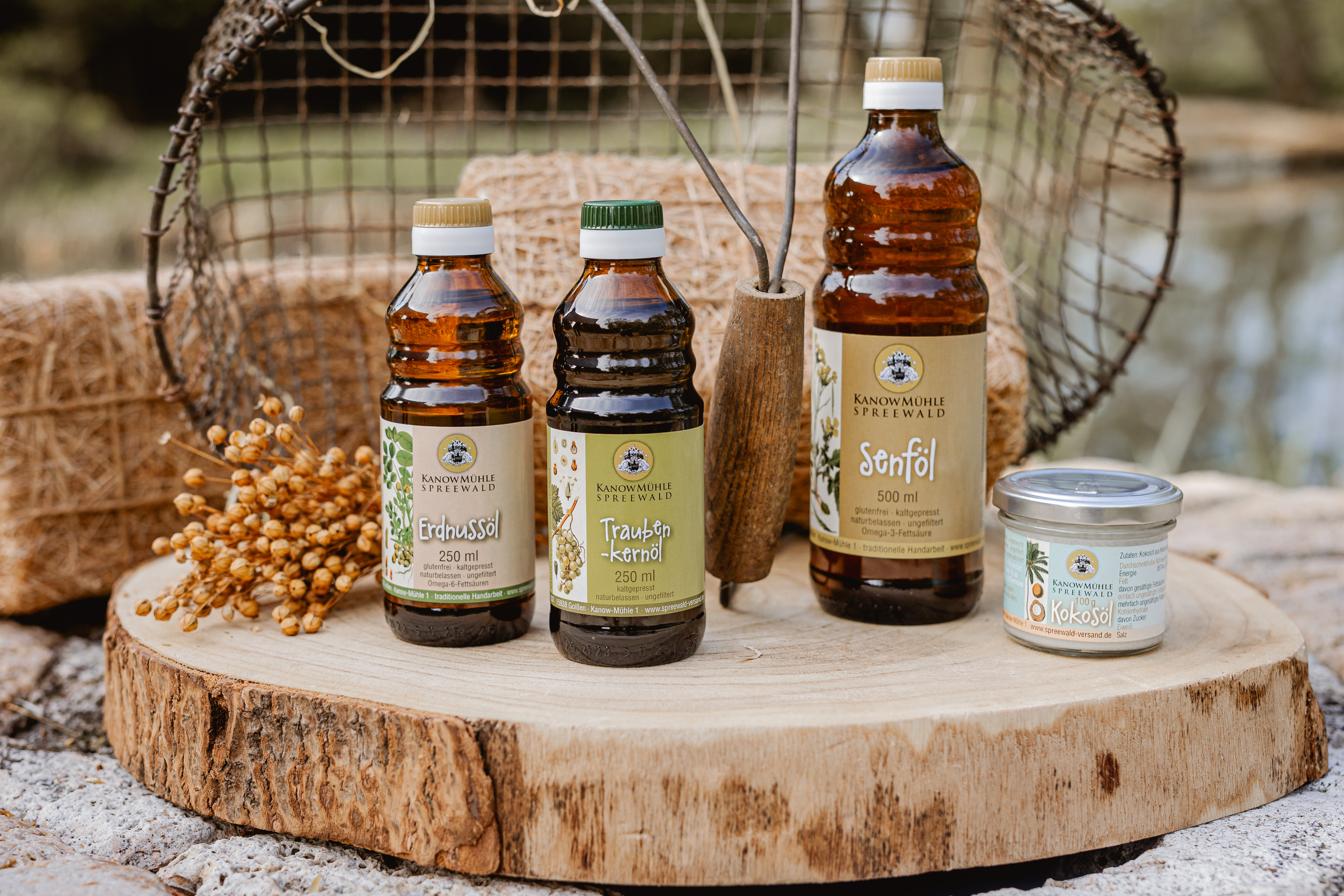 Wir produzieren mehr als 20 verschiedene Naturöle, darunter Klassiker wie z. B. Leinöl, Kürbiskernöl und Rapsöl. Aber auch exotischere Öle, wie Kokosöl, Schwarzkümmelöl und Weizenkeimöl gehören zum Sortiment dazu. Mittlerweile steht immer mehr der ernährungsphysiologische Charakter der Öle im Vordergrund, den sich interessierte
