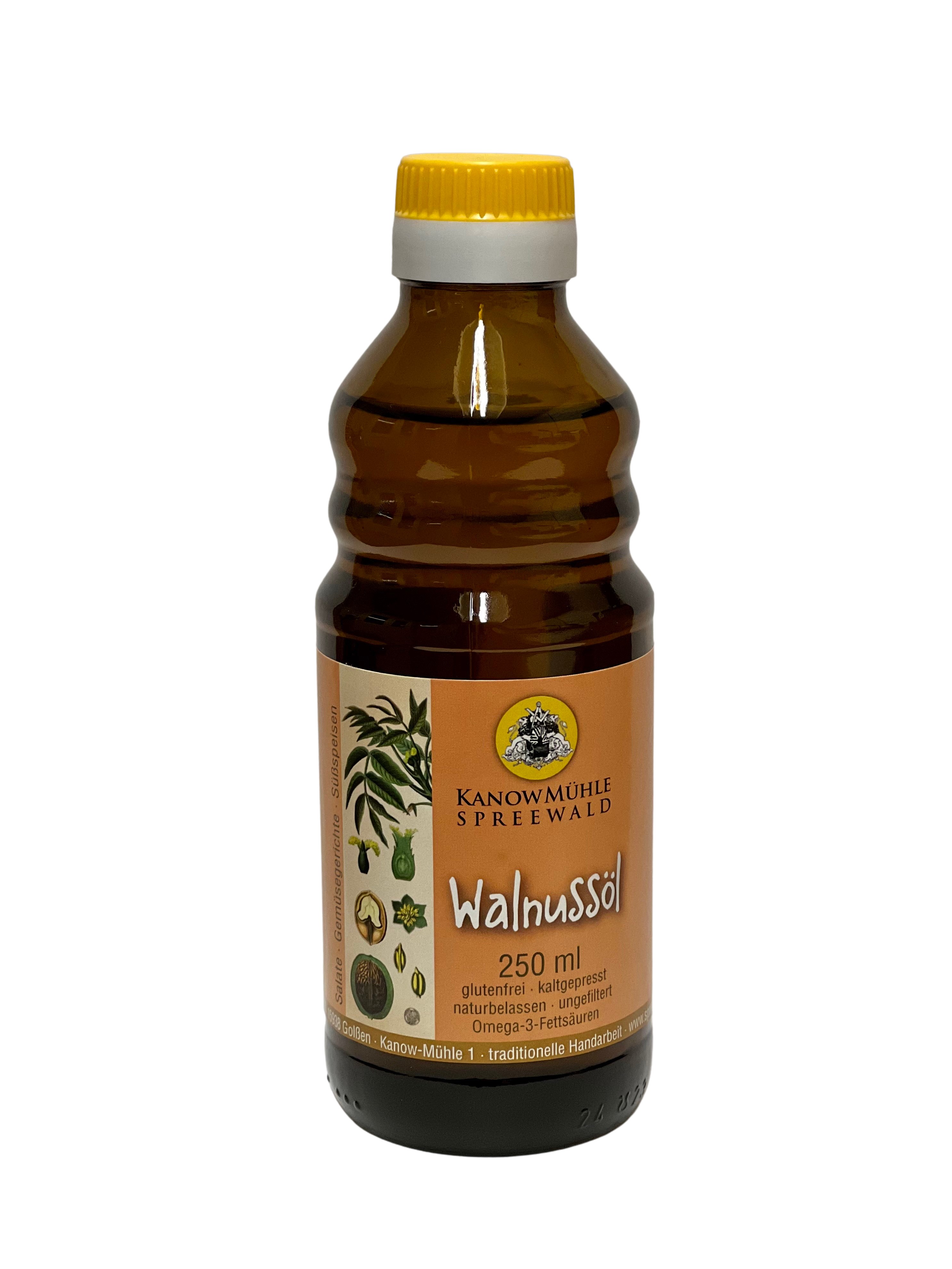 Gewonnen aus den Früchten des Walnussbaumes, bietet ein mildes, nussiges Aroma. Der Baum ist in mittel- und südeuropäischen Ländern sowie Nord- und Südamerika beheimatet. Reich an ungesättigten Fettsäuren, kann es die Gesundheit von Leber, Galle, Stoffwechsel und Atemwegen fördern. In der Küche ideal für kalte Speisen wie Salate, Gemüse und süße Leckereien. Für die Hautpflege, besonders bei fettiger oder Mischhaut, und als Lippenpflege geeignet.